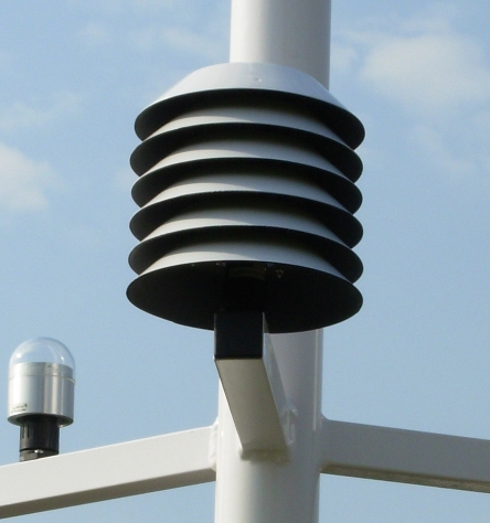 Az antiradiációs kalap (shield) UV-álló fehér polikarbonátból készül, amely még évek múltán is megőrzi fehér színét. A lemezek alsó oldala matt feketére festett, így az árnyékolás hibája 0.2°C alatt tartható még a legnagyobb napsütésben (900-1000W/m2) is.